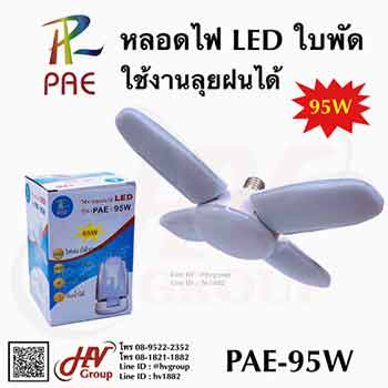 หลอดไฟทรงใบพัดสุดเก๋จากแบรนด์ PAE ขนาด 95W สามารถกันน้ำได้ เป็นหลอดแบบประหยัดไฟที่ใช้งานได้อย่างยาวนานและให้การส่องสว่างในแบบระยะไกล รูปทรงสุดเก๋ด้วยใบพัดที่สามารถพับเก็บได้ เมื่อกางออกแล้วจะมีลักษณะคล้ายคลึงกับพัดลมเพดาน ใช้งานนอกสถานที่ได้สบายด้วยการใส่ถ่าน ซึ่งจะใช้งานได้ยาวนานแน่นอน จึงไม่ต้องเปลี่ยนถ่านบ่อยครั้งให้รู้สึกวุ่นวาย พร้อมการปรับระดับแสงได้ดี จึงใช้งานนอกสถานที่ได้อย่างเหมาะสม สำหรับหลอดไฟจะเป็นหัวแบบ E27 โดยจะใช้พลังงานในขนาด 95W