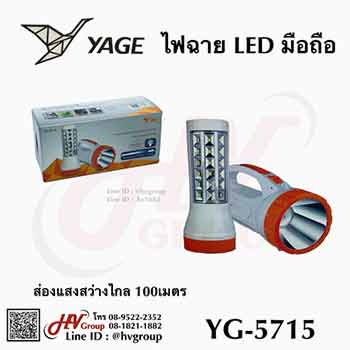 ไฟฉายยี่ห้อ YAGE รุ่น YG-5715 มาในรูปแบบของไฟสปอร์ตไลท์ที่ให้แสงสว่างจากดวงไฟ LED สีขาวสว่าง ด้านข้างมีหลอด LED ขนาด 2W มากถึง 18 ดวง ให้การจุพลังงานแบตเตอรี่ 1,200 mAh พร้อมการชาร์จที่ได้สูงกว่า 200 ครั้งเป็นต้นไป ส่วนของหลอดไฟด้านหน้าจะเป็นหลอด LED ขนาด 1 ดวงให้กำลังไฟ 2W ซึ่งให้แสงที่ไปได้ไกลมากถึง 100 เมตร