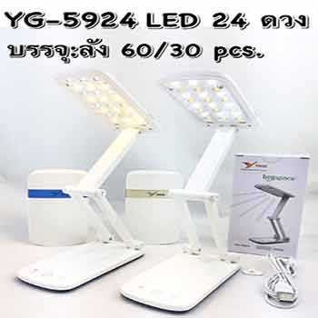 โคมไฟแบบตั้งโต๊ะและเก็บพับได้อย่างสะดวกจากยี่ห้อ YAGE รุ่น YG-5924 ให้ความสว่างด้วยหลอด LED ถึง 24 ดวง ให้โทนแสงไฟสีขาวสะอาดตา อุณณภูมิของหลอดไฟจะมี -10 องศาเซลเซียส ถึง 45 องศาเซลเซียส จึงไม่ก่อให้เกิดความร้อนใด ๆ กำลังของหลอดไฟอยู่ที่ 2.4 วัตต์