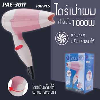 เครื่องเป่าผมยี่ห้อ PAE รุ่น PAE-3011 มาพร้อมระบบปรับแรงลมและดีไซน์ที่ตอบโจทย์สำหรับคนที่ต้องการใช้งานแบบพกพา ที่จับสามารถพับเก็บได้สะดวก ขนาดไม่เกะกะ แม้จะขนาดเล็ก แต่ให้พลังลมแรงได้มาถึง 1000W ช่วยให้เส้นผมตรงสวยเงางาม ลดปัญหาชี้ฟูได้ดี เป่าผมแห้งทันใจ ใช้งานกับไฟบ้านด้วยหัวเสียบแบบ 2 ขา หลังจากใช้งานพับเก็บได้ เน้นใช้งานสำหรับอยู่ในบ้าน หรือนอกสถานที่ได้ ไม่เกะกะ มีหลายสีให้เลือกตามไลฟ์สไตล์ ไม่ต้องกลัวเปลืองพื้นที่ มั่นใจพร้อมด้วยมาตฐาน มอก. ปลอดภัย และทนทานต่อการใช้งานได้อย่างคุ้มค่า