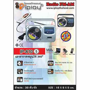 วิทยุเสียงดี ใช้งานง่าย ขนาดเล็กจากยี่ห้อ iPlay รุ่น IP-810(5) ช่วยลดคลื่นรบกวนได้ดีด้วยนวัตกรรมวิทยุรุ่นใหม่ ให้คุณภาพสูงด้วยการผลิตที่ผ่านมาตรฐาน มอก.มาเป็นที่เรียบร้อยแล้ว ลำโพงเป็นเกรด A ที่ถูกทำขึ้นมาให้เป็น Best Quality Sound จึงให้เสียงที่ดี มีความนุ่มลึกของเสียง และให้ความคมชัดในทุกช่องสัญญาณ ไม่ว่าจะเป็นสัญญาณ FM หรือ AM