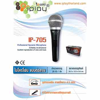 ไมค์ลอยพร้อมสายยี่ห้อ iPlay รุ่น IP-705 ให้เสียงที่มีความคมชัด โดยเป็นไมค์ที่มีเคเบิ้ลยาวถึง 4.5 เมตร ระบบ Dynamic จึงทำให้การใช้งานมีความสะดวกมากขึ้น ขนาดโดยรวมของบรรจุภัณฑ์อยู่ที่ 25.5 x 12.5 X 8.5 เซนติเมตร มีน้ำหนักเบาและขนาดกะทัดรัด สามารถจับได้อย่างสะดวก หัวไมค์เป็นโลหะสีเงินที่มีความแข็งแรงทนทาน รับเสียงได้ดีและเช็ดทำความสะอาดง่าย