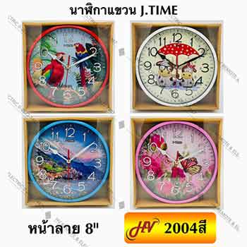 นาฬิกาแบบแขวนติดกับผนังจากยี่ห้อ J-TIME 2004 ให้ความสวยที่เป็นเอกลักษณ์ด้วยหน้าพิมพ์ลายขนาด 8 นิ้ว ช่วยให้ผนังบ้านสดใสกว่าเดิมเป็นเท่าตัว ให้ประโยชน์ทั้งในเรื่องการบอกเวลาที่แม่นยำและของตกแต่งบ้านดีไซน์สวยโดดเด่น ไม่เหมือนใคร เป็นการพิมพ์ลายต่าง ๆ ลงบนหน้าปัดนาฬิกาและให้สีสันของนาฬิกาที่แตกต่างกันตามลายต่าง ๆ โดยมี 4 สี 4 ลาย ให้คุณเลือก คือ สีแดงนกแก้วในป่าใหญ่, สีขาวคู่น้องวัวสุดน่ารัก, สีน้ำเงินวิวธรรมชาติสวย และสีชมพูวิวดอกไม้กับผีเสื้อ
