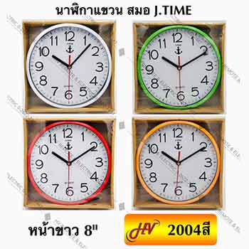 นาฬิกาแบบแขวนติดกับที่มีกรอบคละสี จากแบรนด์ดีอย่าง J-Time ในรุ่น 2004 ในขนาดหน้าจอ 8 นิ้ว ที่แม้ว่าจะดูเล็กเกินไป แต่เมื่อนำมาติดกับผนังจริงแล้วจะทำให้คุณรู้ได้ทันทีว่าไม่เล็กอย่างที่คุณคิดแน่นอน เพราะสามารถบอกเวลาได้ชัดเจน มองเห็นจากระยะไกลได้เพราะมีตัวเลขขนาดใหญ่ หน้าปัดนาฬิกาจะเป็นโทนสีขาวทั้งหมด ดังนั้นตัวเลขกับขีดบอกนาทีหรือแม้แต่เข็มบอกชั่วโมงกับนาทีจึงเป็นสีดำเข้มทั้งหมด