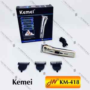 Kemei รุ่น KM-418 ไม่มีสาย ขนาดกะทัดรัด มีรองหวีในกล่องเลือกใช้งานได้ทั้งหมด 3 เบอร์ มีขนาด 3, 6 และ 9 มม. ใบมีดคมพิเศษ ตัดได้ง่าย สามารถตัดได้ในขณะที่ผมหมาด ตัวเครื่องออกแบบให้มีระบบกันน้ำได้ดี มอเตอร์พลังแรงสูง แต่ทำงานเงียบ ไม่ว่าจะตัดผม โกนหนวด หรือตัดจอนก็ทำได้ดั่งใจ ใบมีดสแตนเลสอย่างดี ดีไซน์ตัวเครื่องทันสมัย ทนทาน วัสดุคุณภาพสูง ขณะชาร์จแบตฯ มีไฟแสดงสถานะ กำลังไฟเครื่องอยู่ที่ 3 วัตต์ เสียบชาร์จด้วยแรงดันไฟบ้านทั่วไป 110-220V ใช้เวลาชาร์จเต็มอยู่ที่ 8 ชั่วโมง ใช้งานต่อเนื่องติดต่อกันได้ 60 นาที สามารถใช้งานตัดได้ทั้งผมของผู้ชายและผู้หญิง พกพาสะดวก มีอุปกรณ์พร้อมใช้ในกล่อง ทั้งสายชาร์จ น้ำมันหยอดปัตตาเลี่ยน และแปรงสำหรับปัดทำความสะอาด