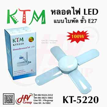 หลอดไฟใบพัดพับได้ยี่ห้อ KTM รุ่น KT-5220 ให้รูปทรงที่คล้ายกับใบพัดของพัดลม สามารถกางออกมาได้ถึง 90 องศาในแต่ละใบ ส่วนขั้วหลอดจะเป็นแบบขั้วเกลียวที่ติดตั้งได้ง่าย พร้อมการใช้งานขั้วแบบ E27 และเป็นหลอดไฟแบบ LED ขนาด 100w ที่จะให้การประหยัดพลังงานได้อย่างดีเยี่ยม ใช้ได้ทุกที่ ติดตั้งได้ง่าย โดยให้แสงสว่างทั้งสีขาวสะอาดและสีวอร์มไวท์ที่คุณสามารถเลือกได้ โดยเป็นแสงแบบถนอมสายตา
