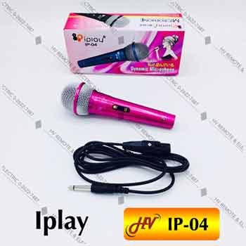 Microphone มีสายยี่ห้อ Iplay รุ่น IP-04 หลายสี ระบบ Dynamic มีระบบป้องกันเสียงรบกวนรอบข้างและลดเสียงแทรกในเวลาที่ใช้งานได้เป็นอย่างดี พร้อมการมีสวิตซ์เปิด-ปิดภายในตัว ให้เสียงออกมาสมจริง มีขนาดโดยรวม 20 x 5 x 4 เซนติเมตร น้ำหนัก 230 กรัม มีเคเบิ้ลแถมมาให้กับไมค์ยาวกว่า 2 เมตร จึงทำให้คุณซื้อเพื่อนำมาใช้งานได้สะดวกในทุกกรณี