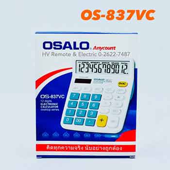 เครื่องคิดเลขจีน Osalo รุ่น OS-837VC แม่นยำ หน้าจอ 12 หลัก ดีไซน์มีความทันสมัย ให้สีสันที่เหมาะสำหรับคนรุ่นใหม่ เป็นเครื่องแบบตั้งโต๊ะที่ใช้งานเพื่อการคำนวณต่าง ๆ ได้สะดวก ให้ความแม่นยำและนับตัวเลขต่าง ๆ ได้ถูกต้อง ตัวเลขปรากฏเป็นเลขดิจิตอลสีดำมองเห็นได้ชัดเจน เป็นเครื่องแบบ Two Way Power โดยใช้ได้ทั้งแสงอาทิตย์และแบตเตอรี่อย่างเหมาะสม ไม่เปลืองพลังงาน ทุกครั้งที่เปิดใช้จึงให้ประโยชน์ได้ยาวนาน วัสดุที่ใช้เป็นพลาสติกคุณภาพดี