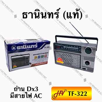 วิทยุยี่ห้อธานินทร์ รุ่น TF-322 ส่งตรงจากแหล่งผลิต แบรนด์แท้ 100% มาพร้อมกับเอกลักษณ์การดีไซน์มิติใหม่ ให้คุณใช้งานเสียบกับไฟบ้านได้ หรือจะใช้งานกับถ่านขนาด D จำนวน 4 ก้อน มีรางใส่ถ่านอยู่ด้านหลัง และเป็นตำแหน่งเก็บสาย AC ได้ด้วย สะดวกในการพกพา ไม่ว่าจะใช้ในบ้าน นอกบ้าน หรือจะพกพาไปเป็นเครื่องเสียงแห่งความบันเทิงในระหว่างเดินทางก็ได้เช่นเดียวกัน