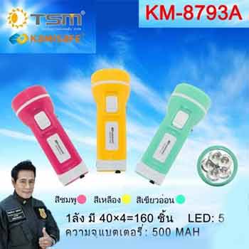ไฟฉายยี่ห้อ TSM รุ่น KM-8793A มีให้เลือก 3 สี คือ สีชมพู, สีเขียวอ่อน และสีเหลือง ให้ความจุของแบตเตอรี่ภายใน 500 mAh มีขนาดที่กะทัดรัด นำออกไปใช้นอกสถานที่ได้เหมาะสม ไม่เพิ่มน้ำหนักในกระเป๋าแน่นอน สามารถชาร์จพลังงานไฟฟ้ากับไฟบ้านได้ตามปกติ พร้อมให้การใช้งานที่สะดวกด้วยสวิตช์เลื่อนเปิด-ปิด
