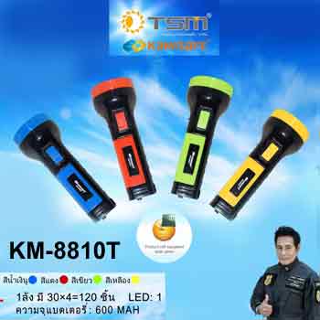 ไฟฉายมือถือยี่ห้อ TSM รุ่น KM-8810T มี 4 สีให้เลือกใช้ตามความชอบ คือ สีแดง, สีน้ำเงิน, สีเหลือง และสีเขียว ภายในจะบรรจุแบตเตอรี่ที่สามารถจุไฟได้ถึง 600 mAh แสงสว่างเป็นโทนสีขาว ให้วงกว้างของแสงได้ดี ใช้งานได้หลากหลายรูปแบบ มาพร้อมด้ามจับที่ถนัดมือและสวิตช์ที่ใช้งานง่าย เป็นรูปแบบการชาร์จพลังงานไฟฟ้าที่ชาร์จ 1 ครั้ง จะใช้งานได้สูงสุดถึง 12 ชั่วโมง